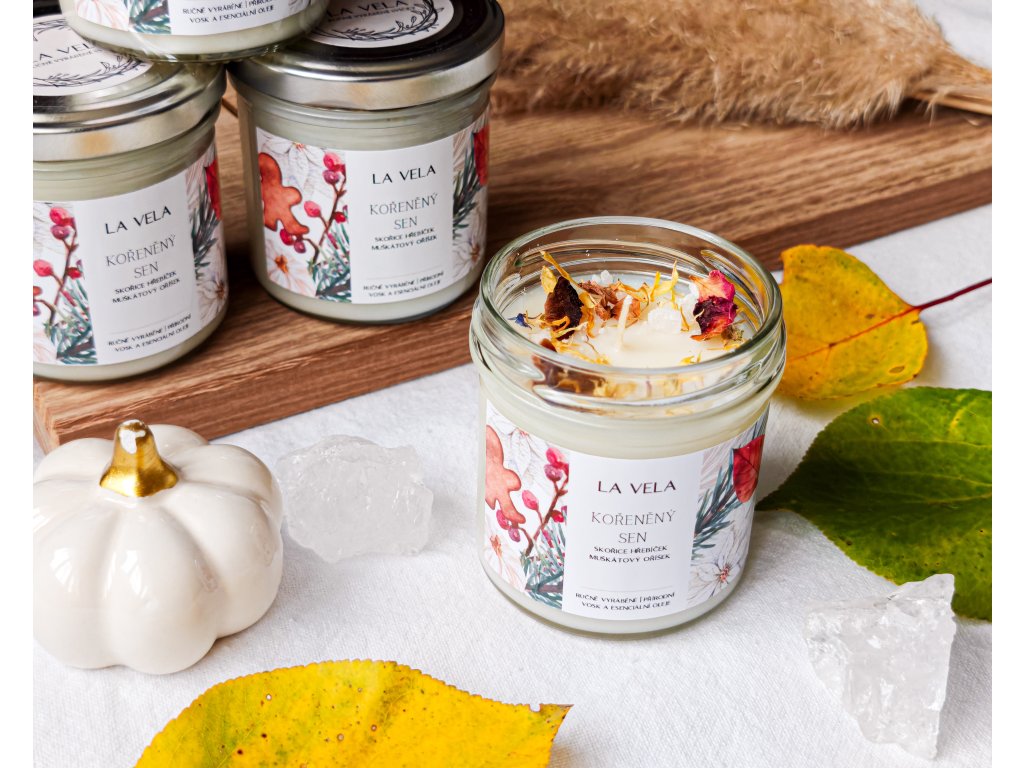 Kořeněný sen 130 ml - svíčka s esenciálním olejem skořice, muškátového oříšku a hřebíčku